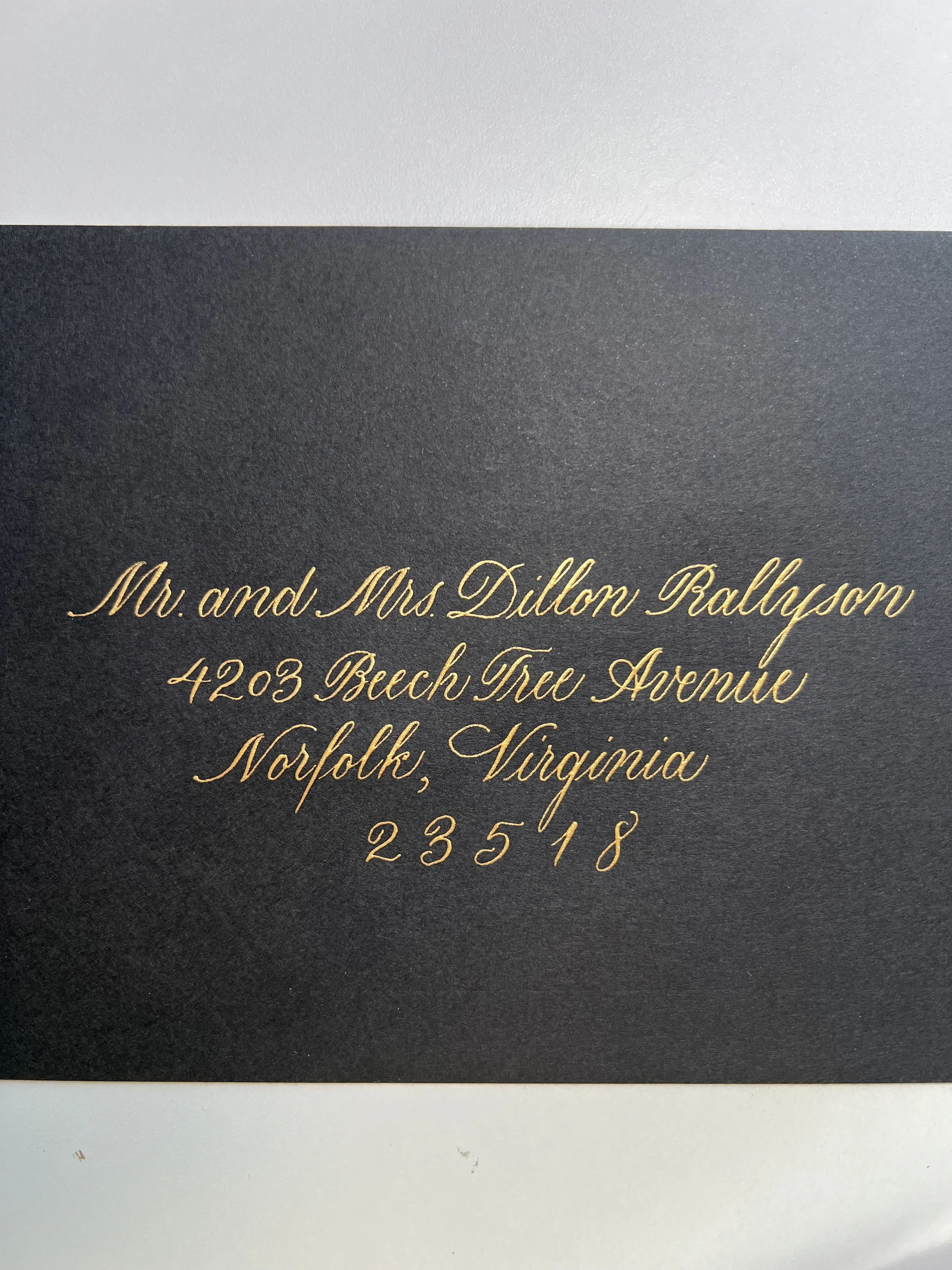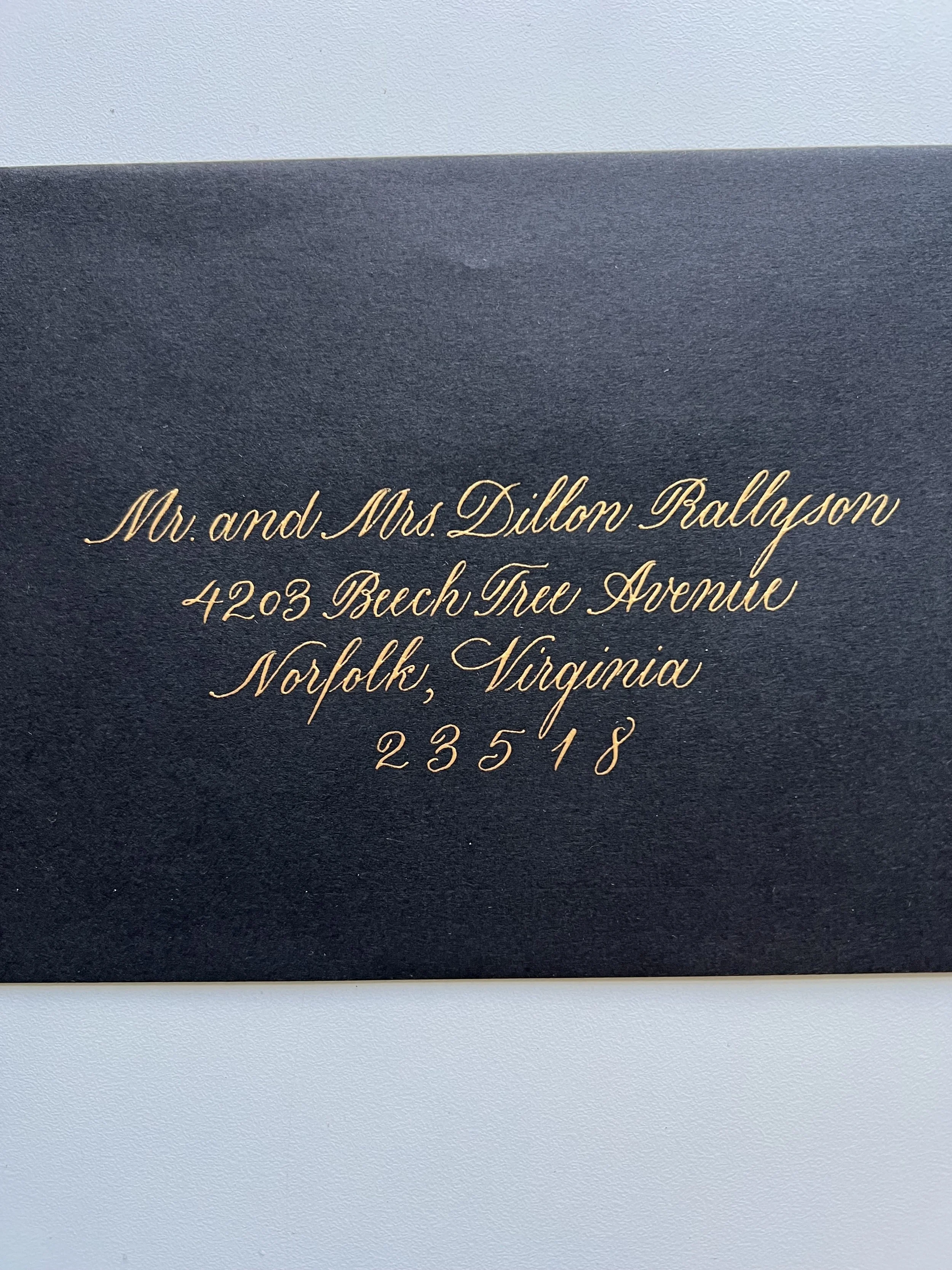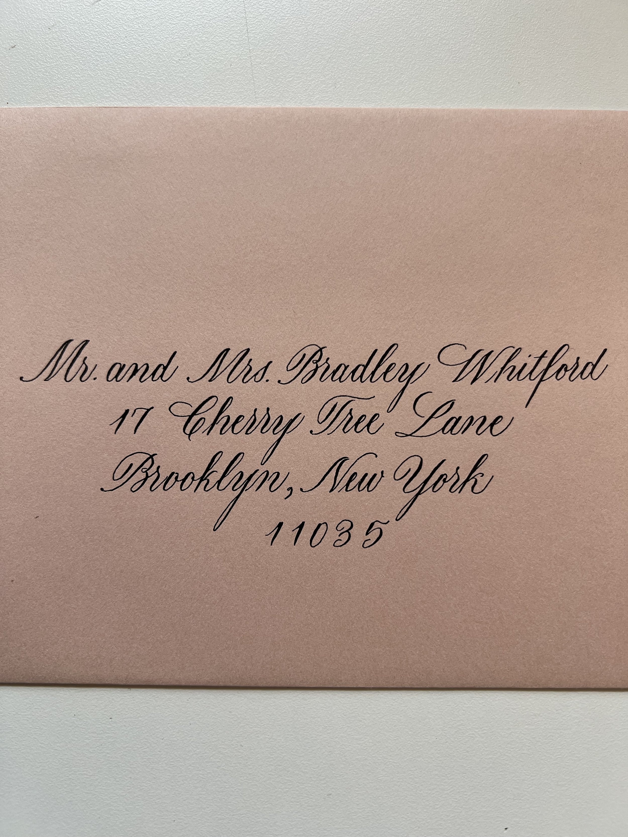 Kate is named after my mom. More traditional, definitely what comes to mind when you think “cursive,” or when your mom thinks of when she thinks “calligraphy.” This style is the closest thing I offer to Copperplate. Kate has various amounts of flourish. (We can turn the dial up and make it very ribbony and curly, but pull back for a less ornate look.)