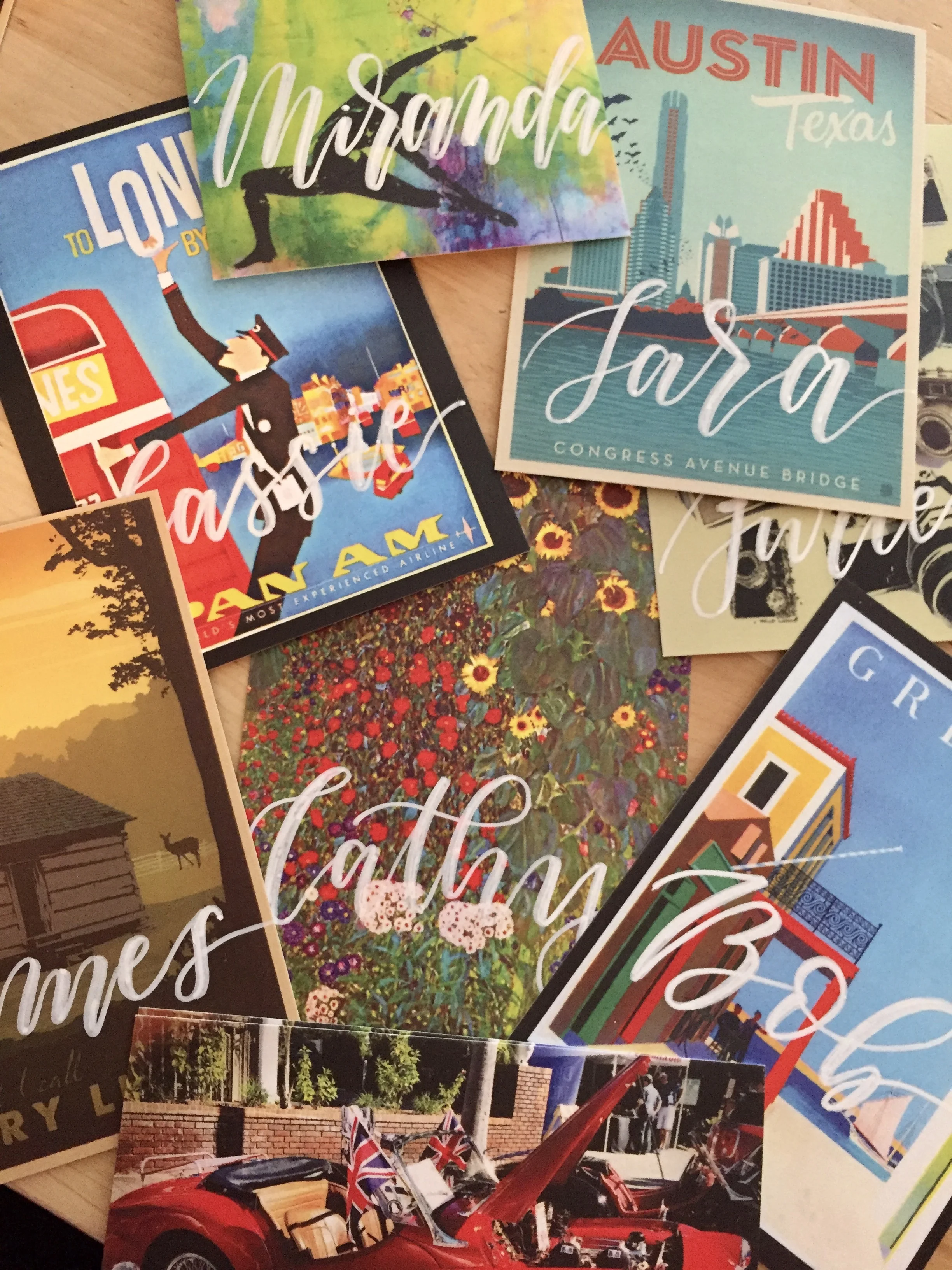 Erica came to me with adorable vintage postcards she wanted to use as Save the Dates: handwritten like a little wedding poster for each of her guests. Each postcard was different than the next, and each one hand picked specifically for it's recipient. So adorable! They were a huge hit. Well months later, the wedding date is fast approaching, and Erica decided she wanted to get a whole new batch of vintage postcards and use them as escort cards, personalized with her guests names with a new picture specific to each guest! I love this idea. And they are super fun to make! And as a Save the Date? So cost effective! No envelope or fancy postage needed!:)